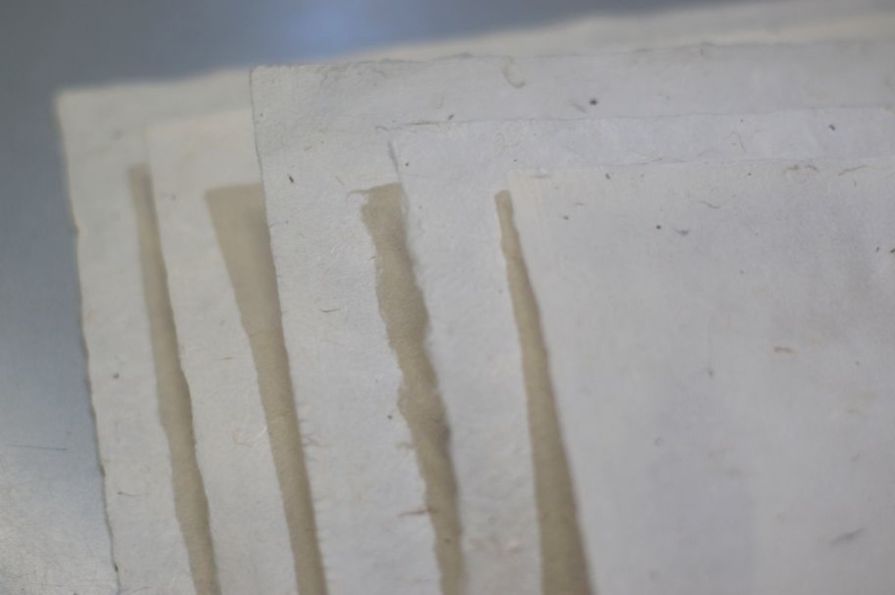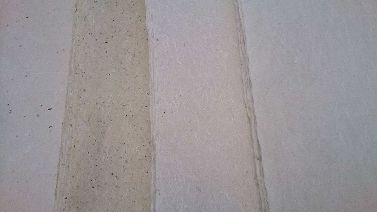 トラフコウゾ皮、ちりよりの細かな繊維・小皮を漉き込んだ白い紙です。