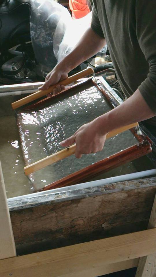 白石産のトラフコウゾの栽培から始まり、材料の下処理と加工、そして手漉きや乾燥に至るまで、白石和紙の技法を守り漉きあげた1枚です。