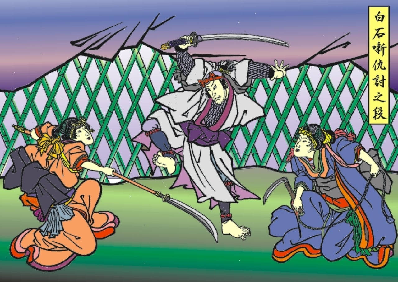 塗り絵 白石噺 「仇討ち之段」の仇討ちの場面を描いた 仇討ちの場面を描いた塗り絵。